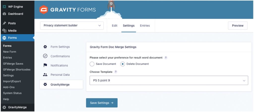Once you’ve created your form and your docx template, and uploaded your template to GravityMerge, you need to link your template to your form. This is done at the form level, via [Form] > Settings > GravityMerge.
