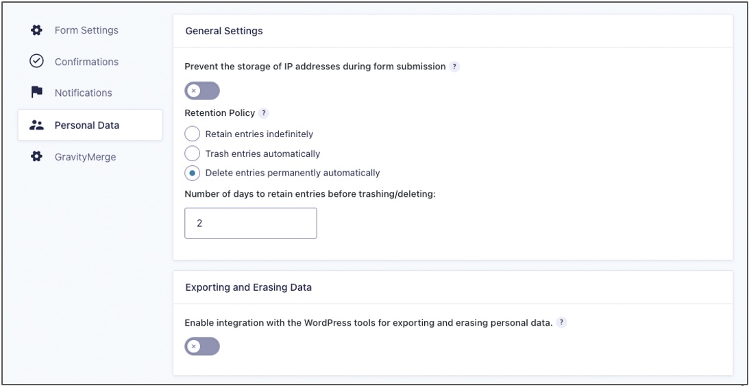 For more information on these settings, see the Gravity Forms documentation at https://docs.gravityforms.com/personal-data-settings/