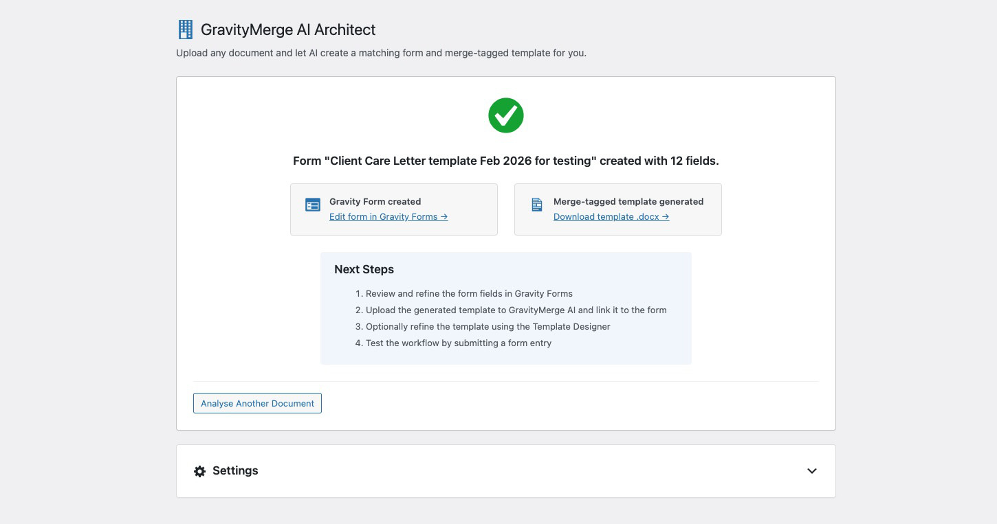 Architect is a setup assistant that uses AI to convert an existing document into a complete document automation workflow. Upload a contract, policy, letter, or other document, and Architect analyses it to identify variable content and generates both a matching Gravity Forms form and a merge-tagged GravityMerge AI template.