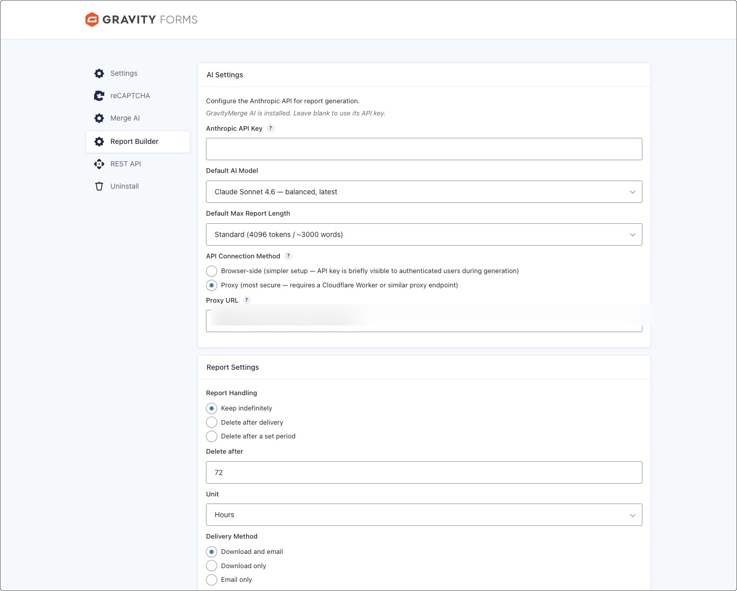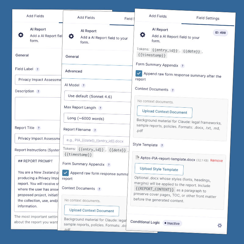 - Multiple report fields per form: Add more than one AI Report field to a form. Combined with Gravity Forms conditional logic, different form answers can trigger different report configurations.