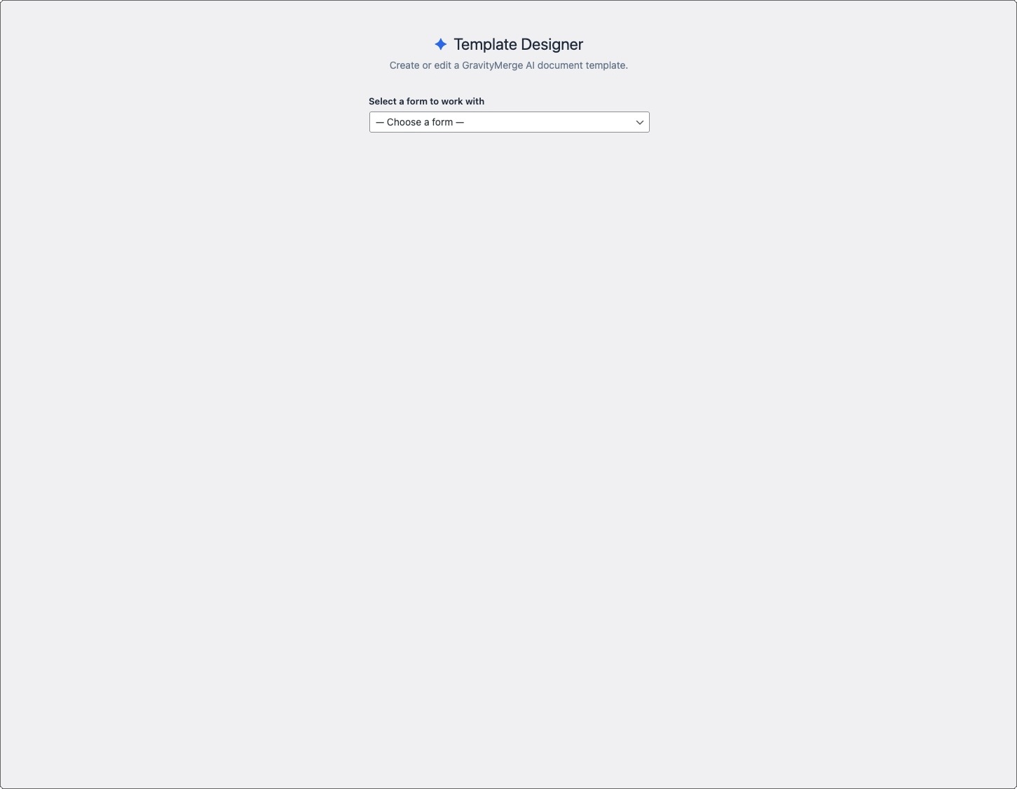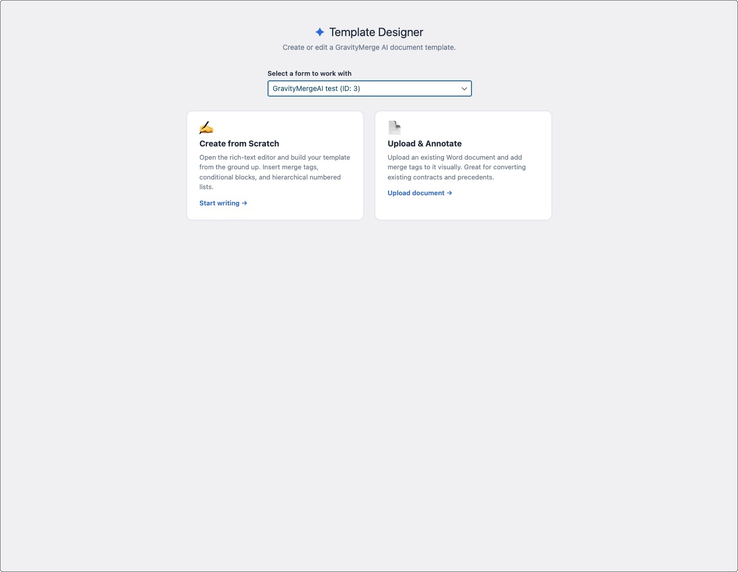 Create GravityMerge AI document templates directly in your WordPress admin. Choose between two modes: create a template from scratch using the built-in rich text editor, or upload an existing Word document and annotate it with merge tags visually. Template Designer knows your form fields and handles the merge tag syntax for you.