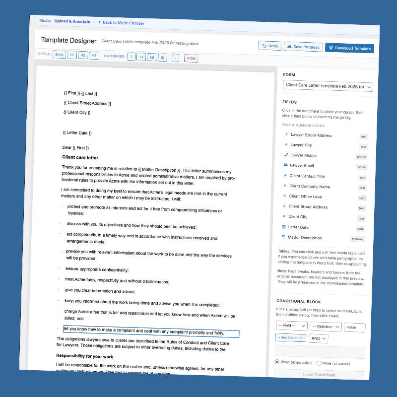 - Clause Bank: Store and organise reusable text snippets such as standard clauses, boilerplate paragraphs, disclaimers, etc. Insert any snippet into your template with a click.