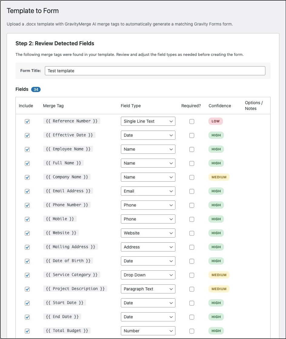 Template to Form works in reverse from the normal workflow. If you already have a GravityMerge AI template but haven’t yet built the matching Gravity Forms form, this plugin creates the form for you. It parses the template to extract every merge tag, conditional block, and loop structure, then intelligently infers the best Gravity Forms field type for each.